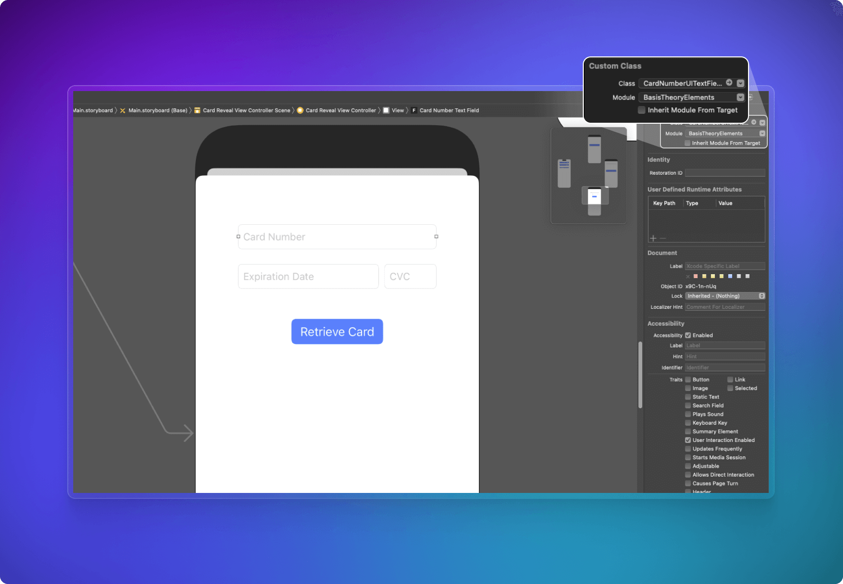 In the window that appears, type in "cardNumberElement", "cardExpirationDateElement" and "cardVerificationCodeElement" respectively for the Name of each element and click Connect. Then Xcode should suggest you import BasisTheoryElements, so let's go ahead and do that now.