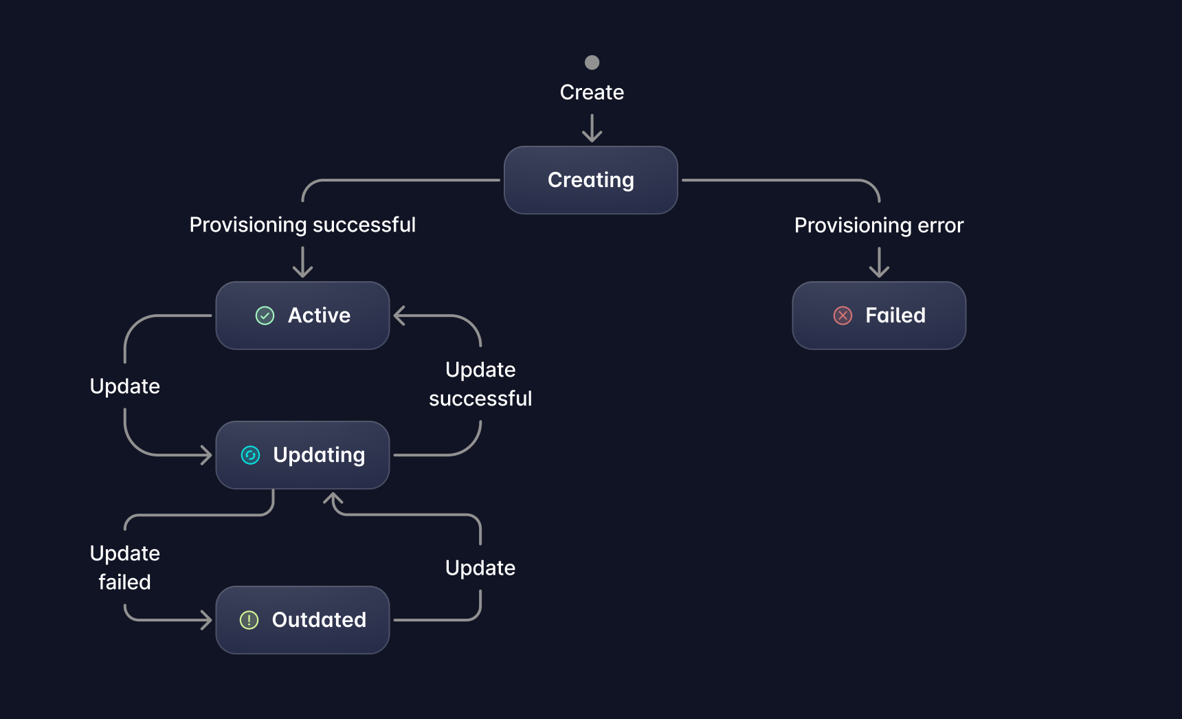 | creating → failed | Provisioning error (e.g., invalid dependencies, syntax error in code) |
