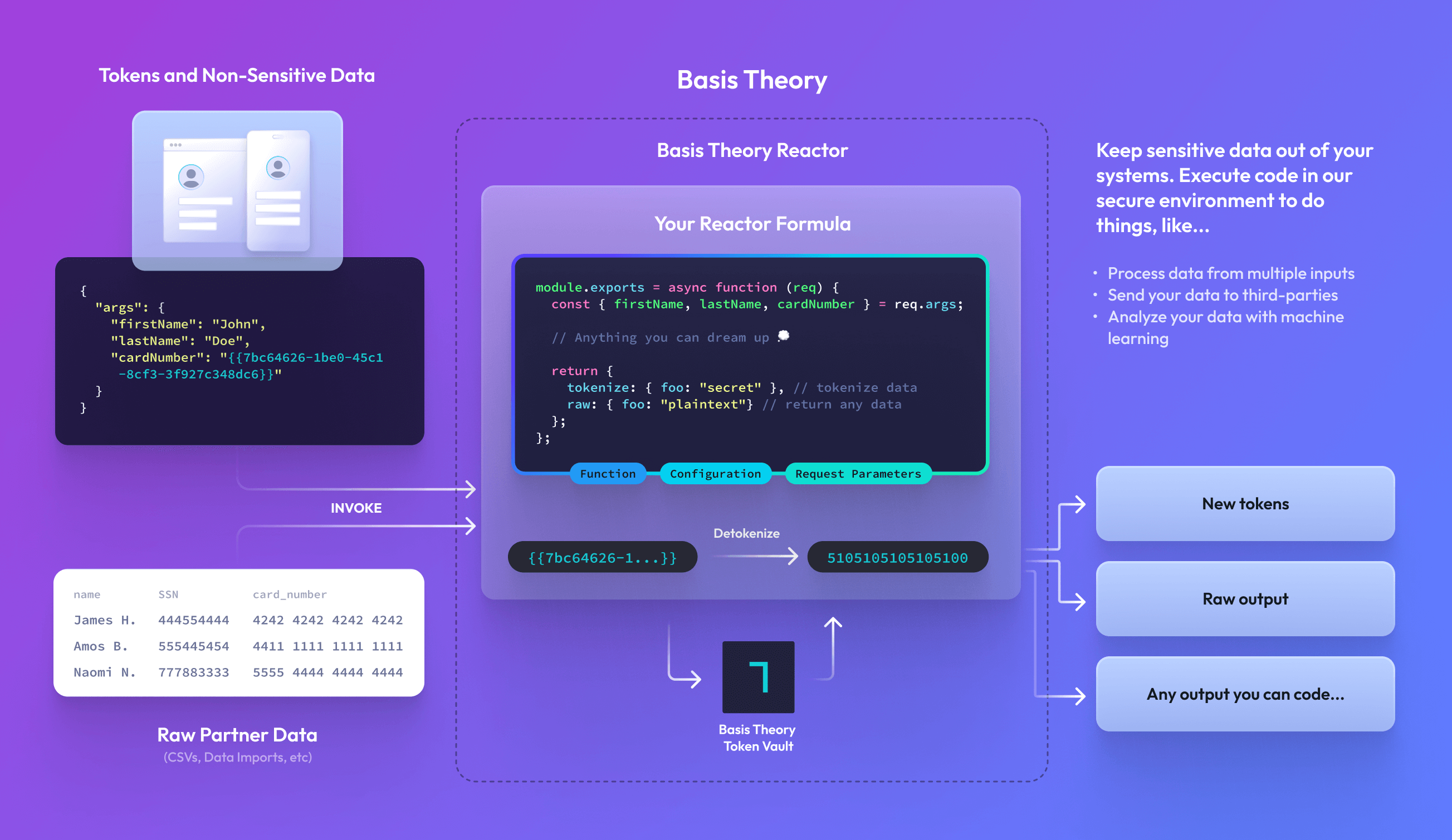 A Reactor is a serverless compute service allowing Node.js code hosted in Basis Theory to be executed against your tokens completely isolated away from your application and systems.