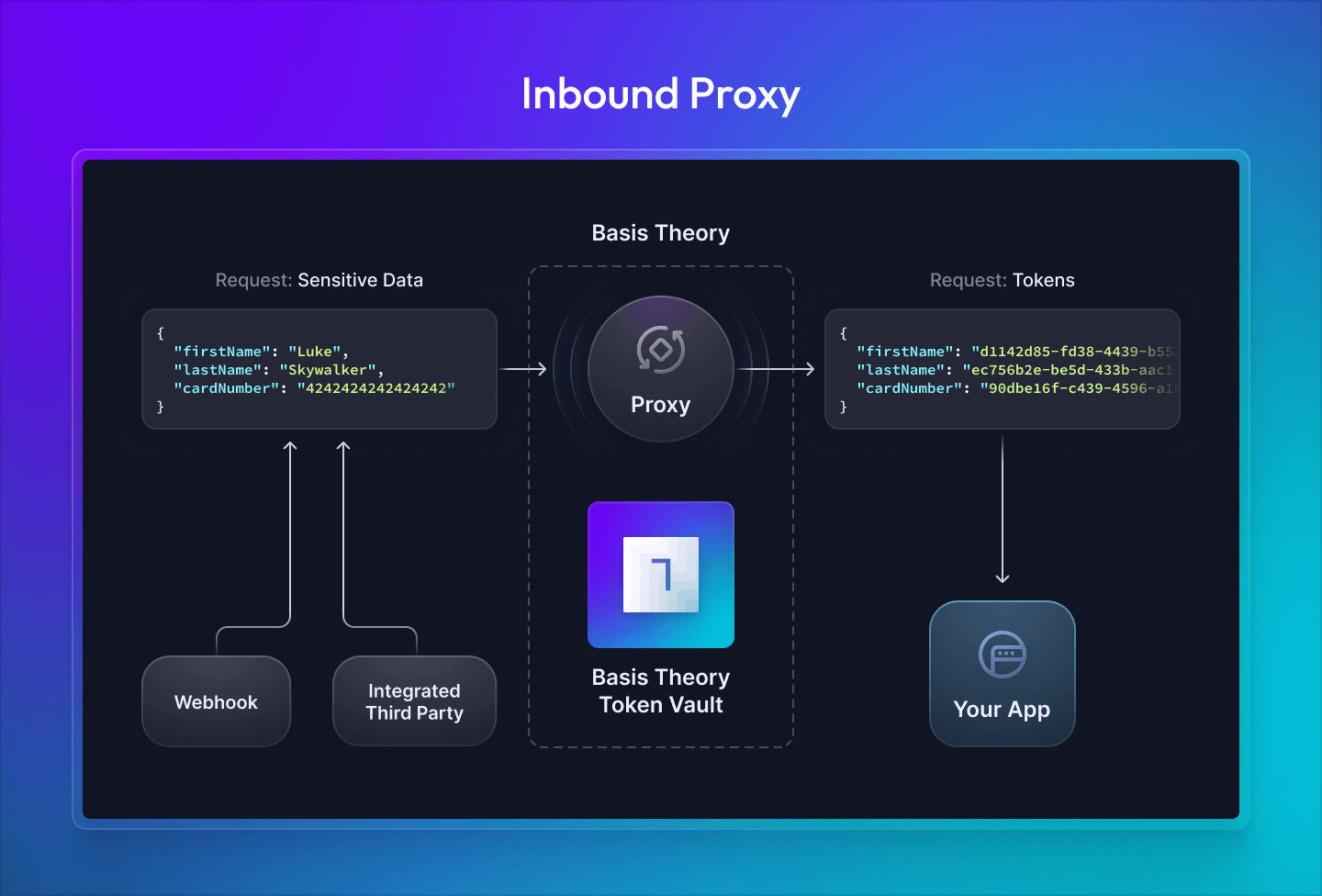 Third parties that integrate into your systems by calling an HTTP API may include sensitive data within their requests. Inbound HTTP requests into your system can be routed through the proxy to parse and tokenize sensitive pieces of data and substitute non-sensitive token identifiers into the request payload before it reaches your servers.