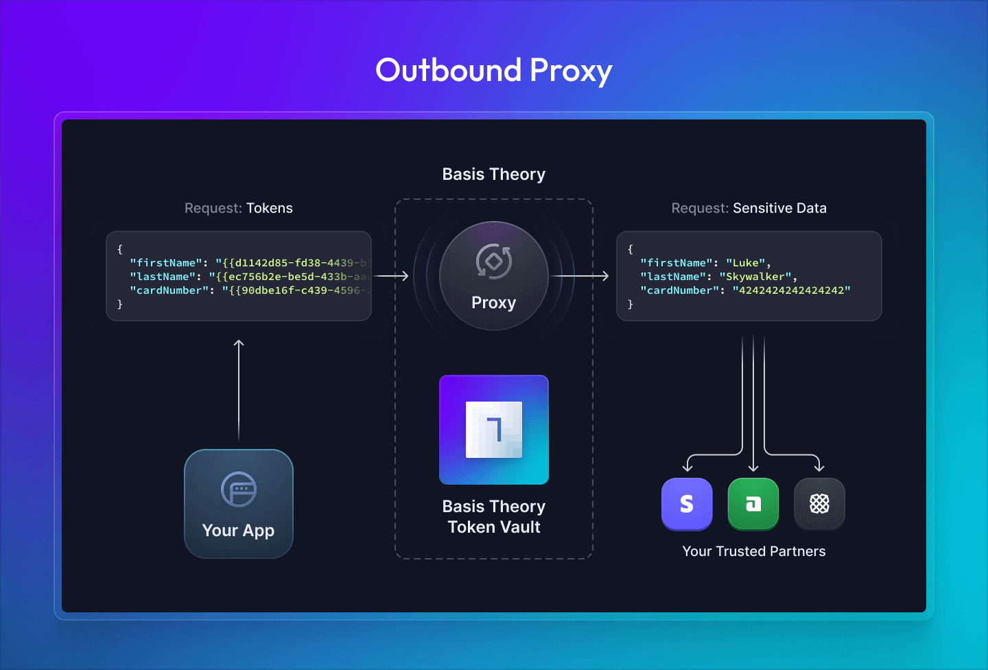 Outbound HTTP requests initiated from your system can include tokens within the request payload, and the proxy can detokenize and substitute the token data into the request before forwarding it to the desired destination. This makes it easy to share sensitive data with a third party without needing to first retrieve and manipulate this sensitive data on your servers.