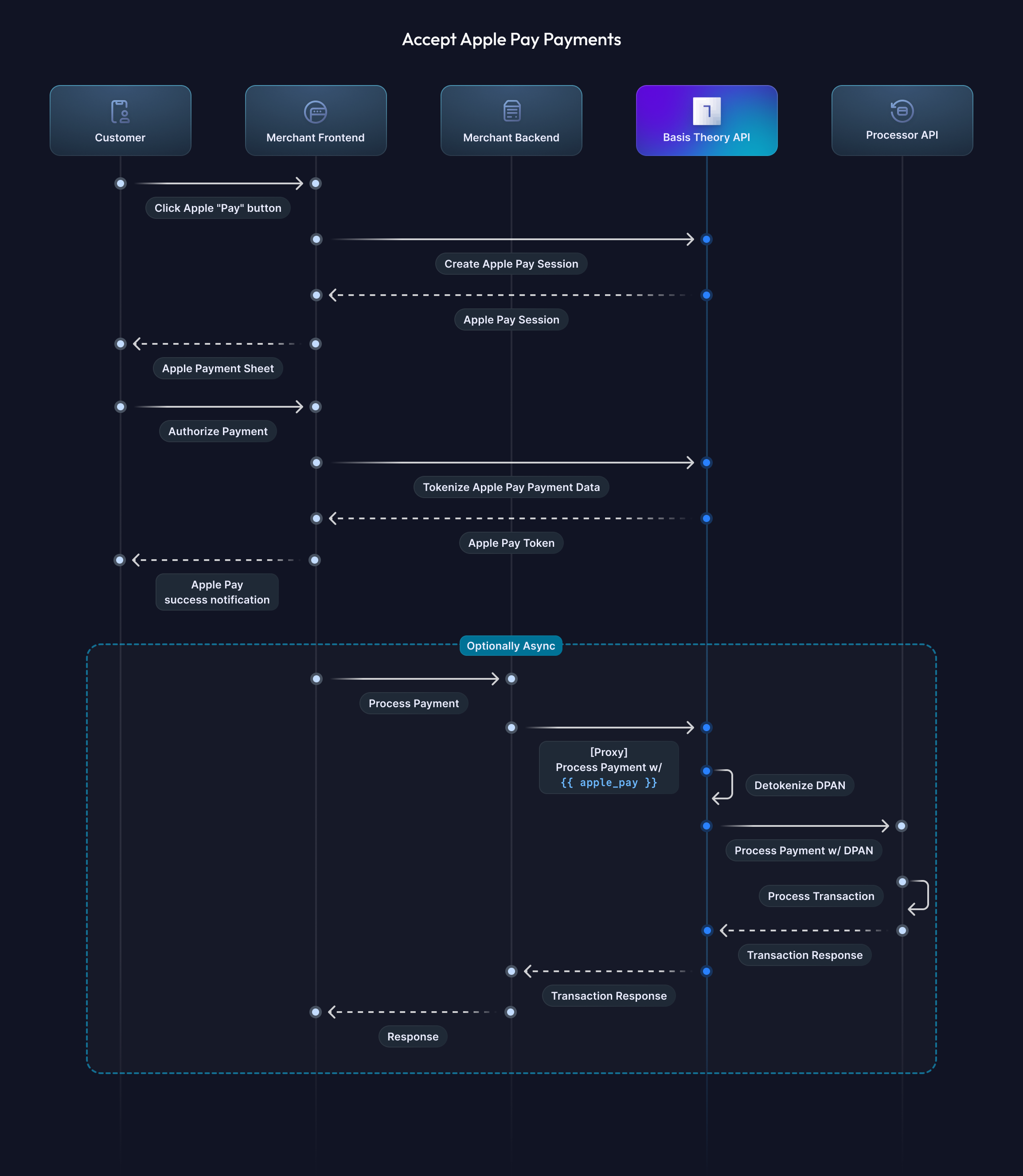 This guide explains how to accept Apple Pay™ payments using Merchant-Provisioned Account Numbers (MPANs) with the Basis Theory platform to handle PCI-sensitive data securely. MPANs are specialized tokens provided by Apple that enable merchants to accept payments for recurring transactions, subscriptions, and other ongoing payment scenarios.