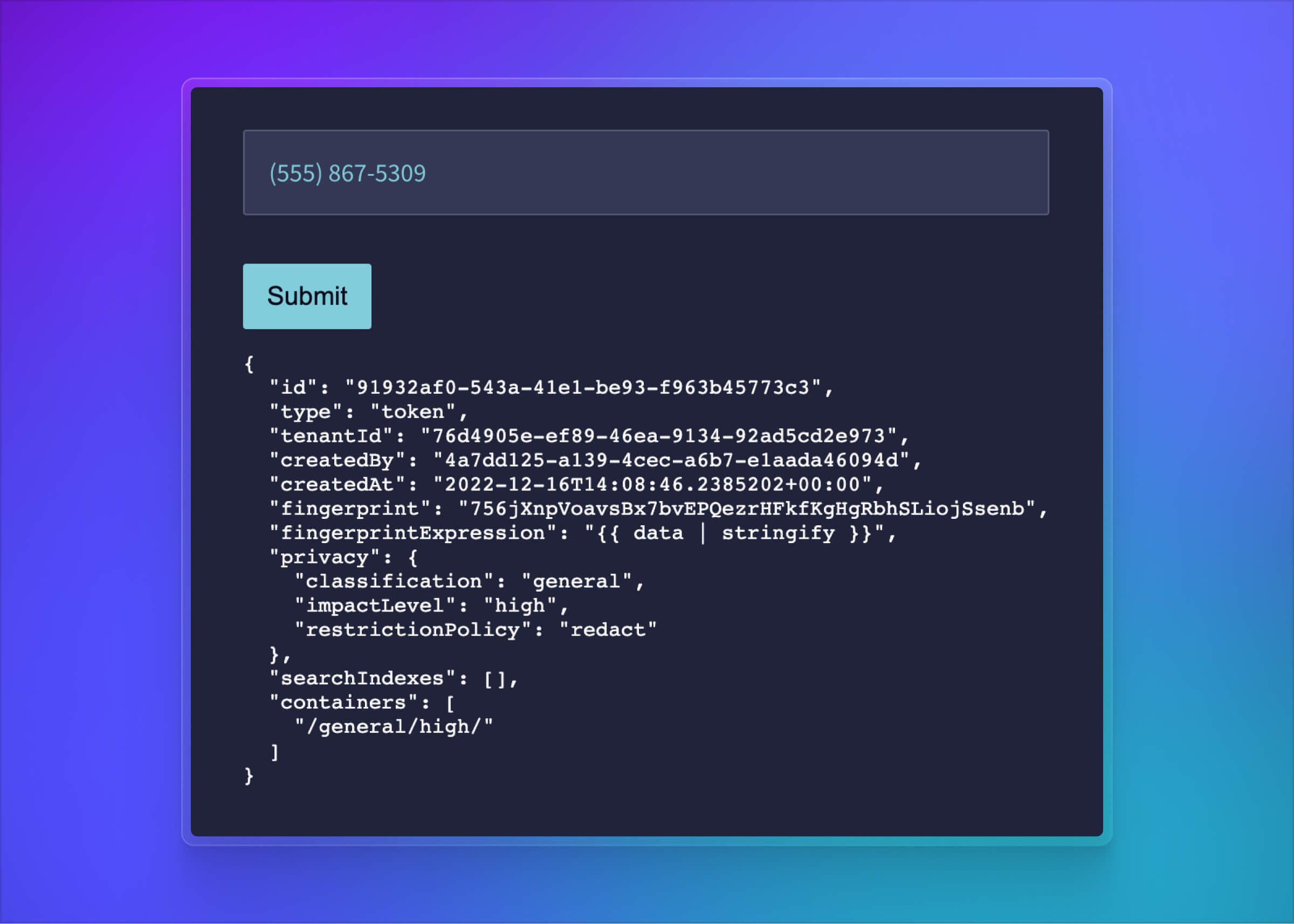 With our mask, we can type in a phone number of (555) 123-4567, however, we want to ultimately tokenize the value as 5551234567 we can control formatting later for display purposes or forwarning to a third-party.