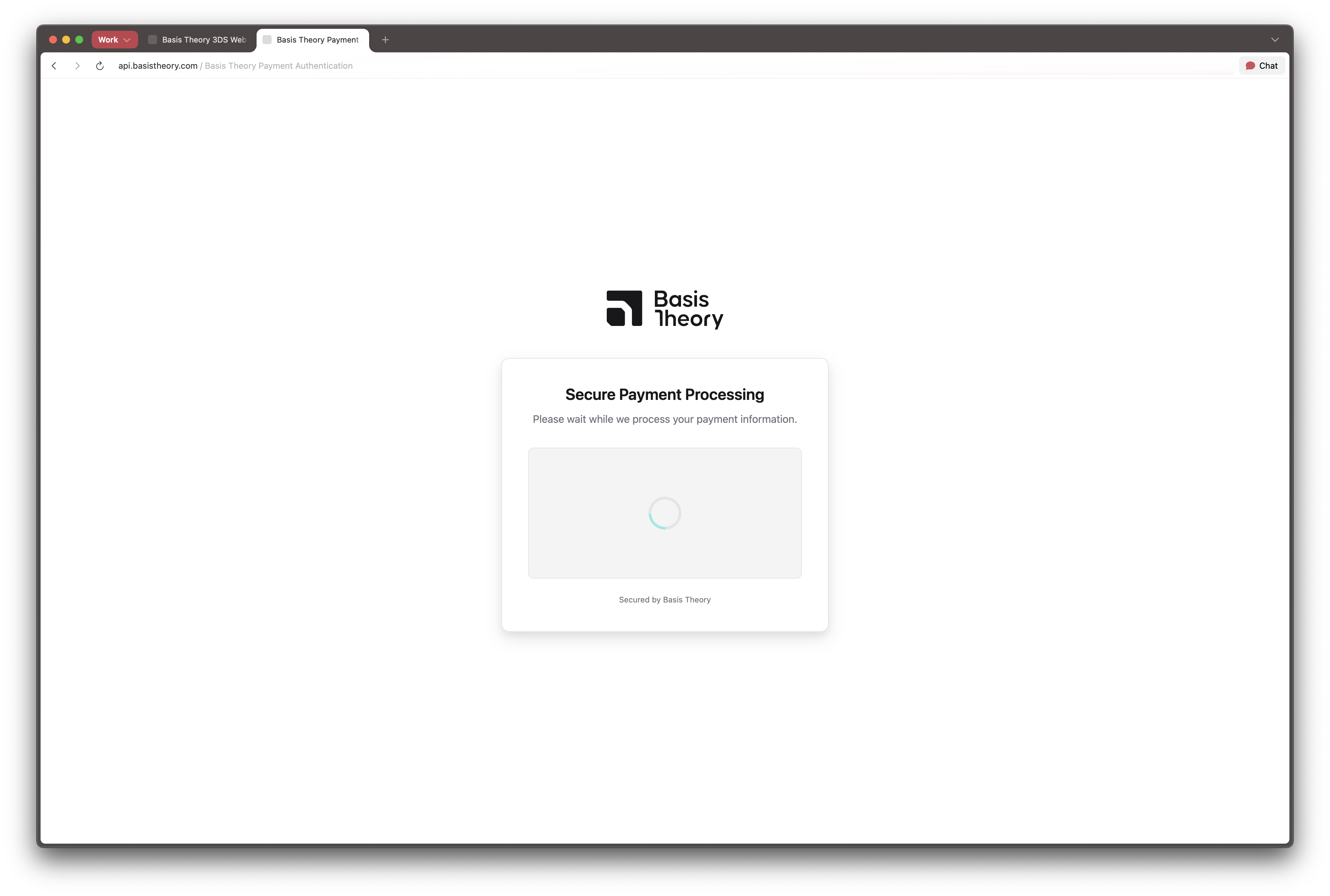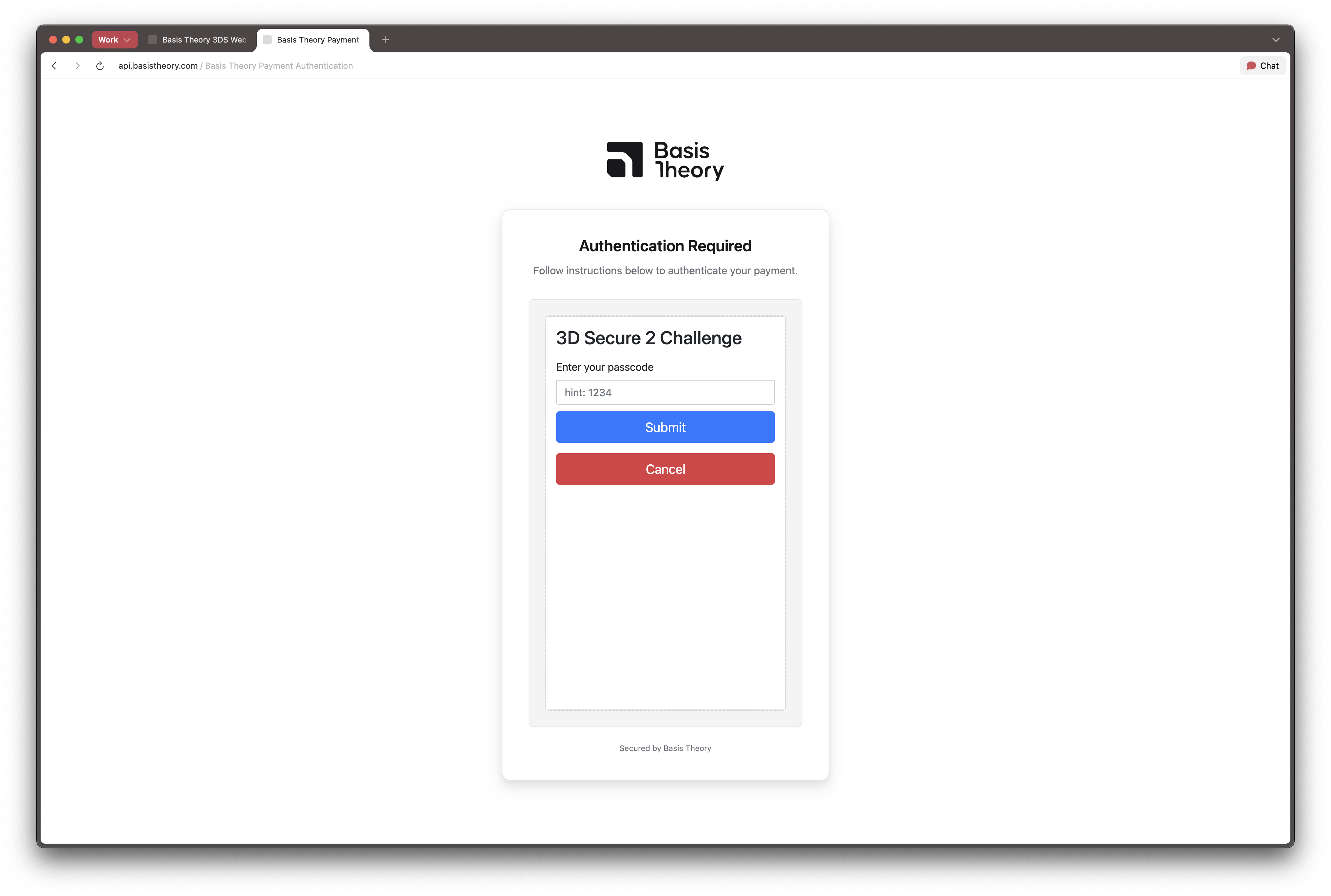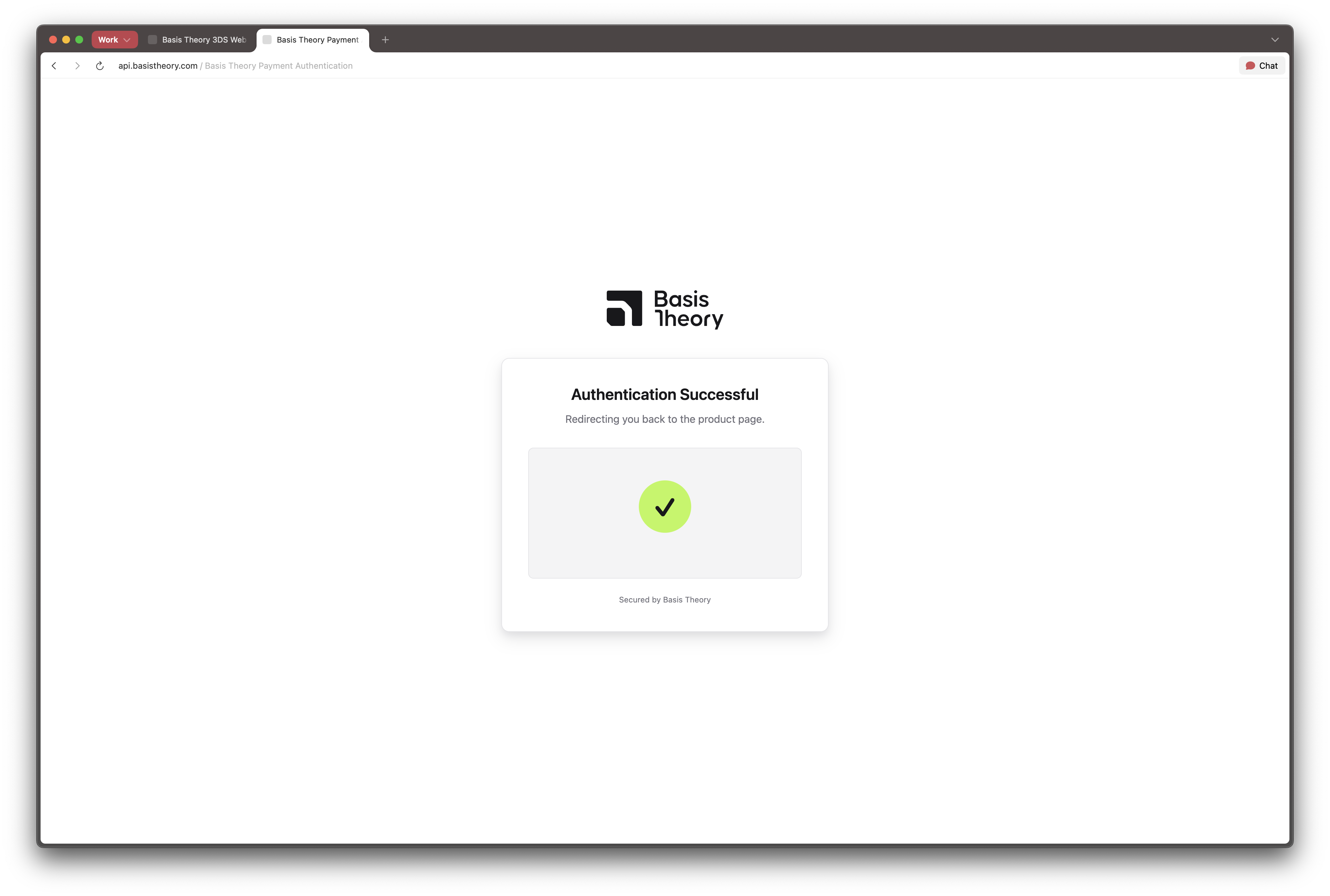 The device data collection, authentication and challenge handling is all performed by Basis Theory inside the provided redirect_url.